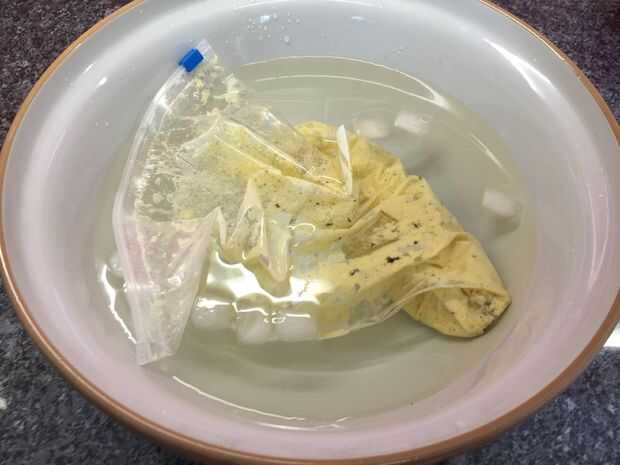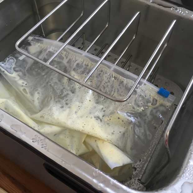 Precaliente el sous-vide baño de agua a 85 grados C / 185 grados f el. Coloque la bolsa de natilla en, asegurándose de que la crema quede por debajo del nivel de agua. Cocinar durante 1 hora, agitando la bolsa cada 20 minutos para asegurar una mezcla. Hundir la bolsa en un recipiente de agua helada, luego enfriar en la nevera durante la noche.