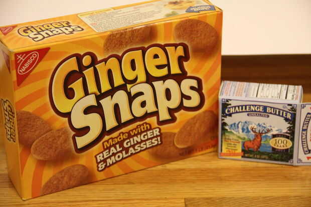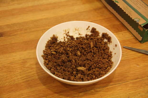 Aplastar algunos jengibre encima migas. Le toca a usted y sus preferencias de helado para decidir cuántas galletas utilizas - fui por sobre un tazón de fuente-ful de migas.