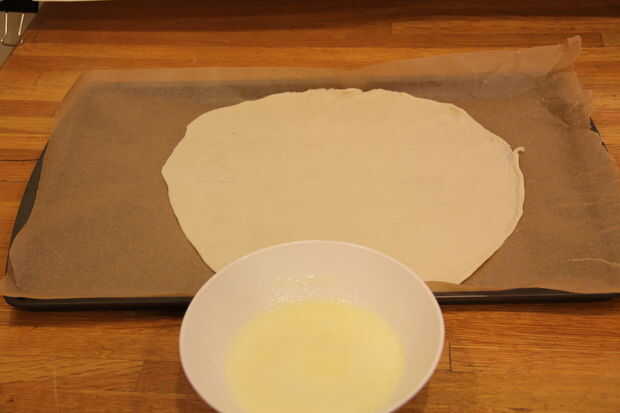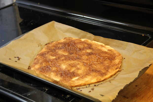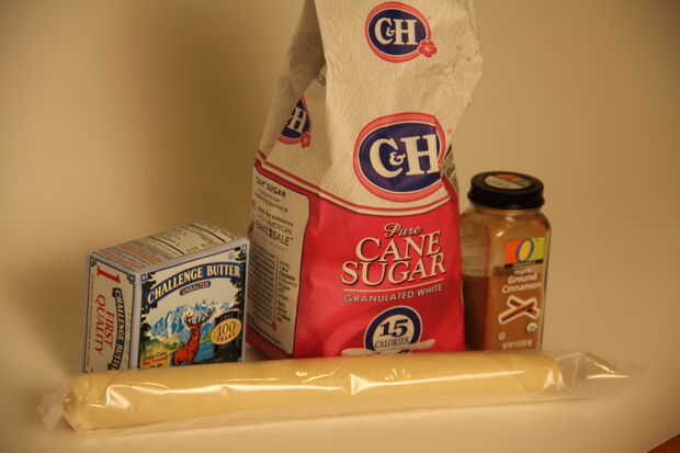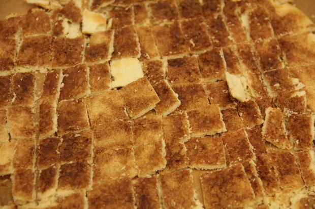 Estirar la corteza en una placa para horno forrada con papel pergamino. Extender la parte superior con mantequilla derretida y espolvorear con azúcar de canela.