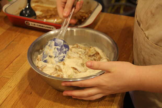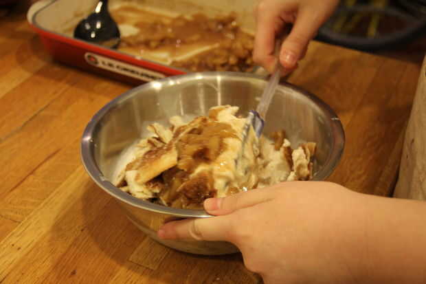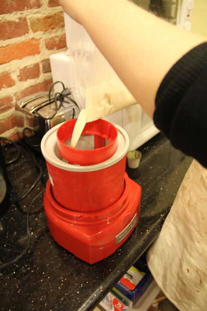 Vierta la mezcla en tu heladora y dejarlo funcionando. Después de unos 15-20 minutos, o menos si tienes una máquina mejor, tu helado debe tener una buena textura de helado. Vierta en un tazón (mejor de metal). Doble en tus manzanas y la corteza, dejando algunos para guarniciones finales si lo deseas.