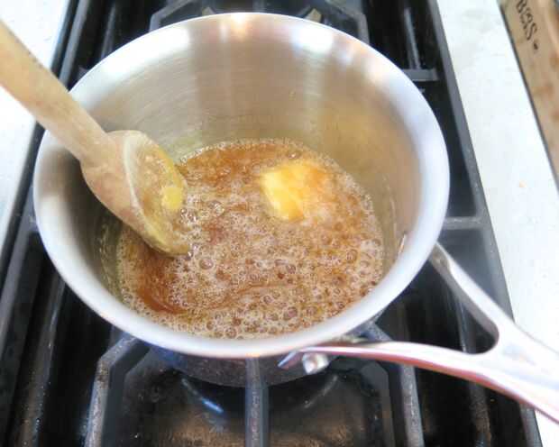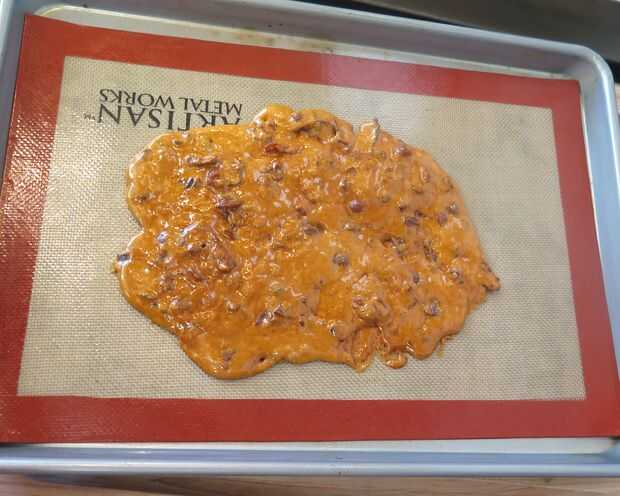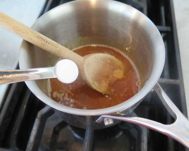 Derretir el azúcar por poner en una cacerola a fuego medio o alto hasta que el azúcar se derrita. Asegúrese de que se revuelve constantemente para evitar quemarlo. Cuando se haya derretido y un color dorado, retirarla de la estufa y agregue la mantequilla, añadir el bicarbonato de sodio, tocino y Chile en polvo. Al agregar el bicarbonato de sodio, el azúcar debe de burbuja y tipo de fizz y vuelta opaco. No sabía que iba a suceder, pero es genial para ver!