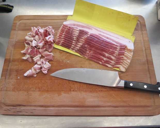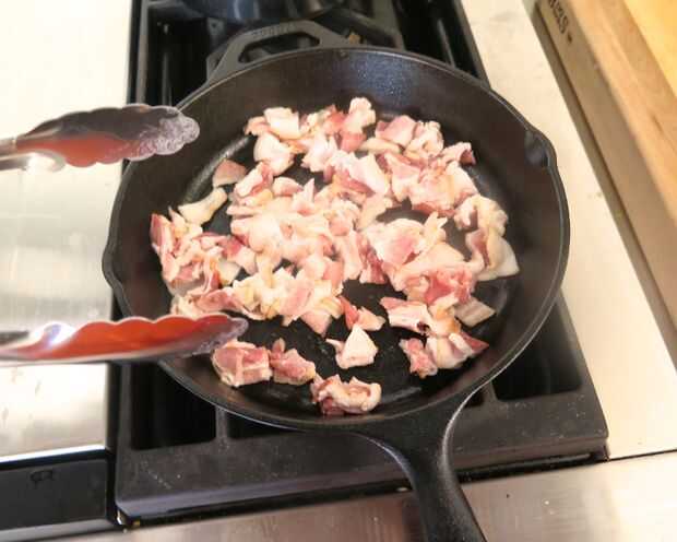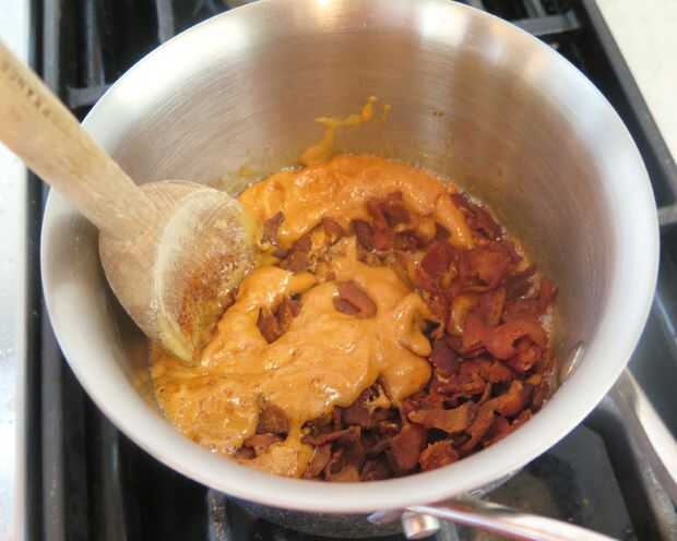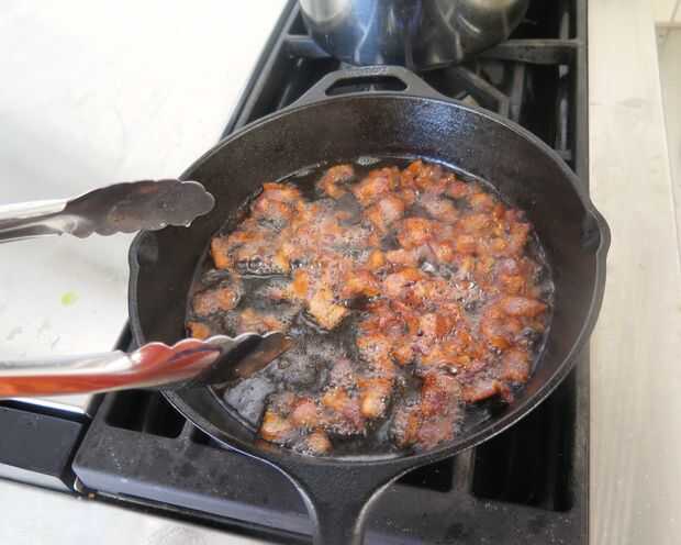El tocino quebradizo, corte la media libra de tocino en trozos pequeños y cocinar hasta que esté dorado y crujiente. Poner las piezas en algunas toallas de papel para drenar.