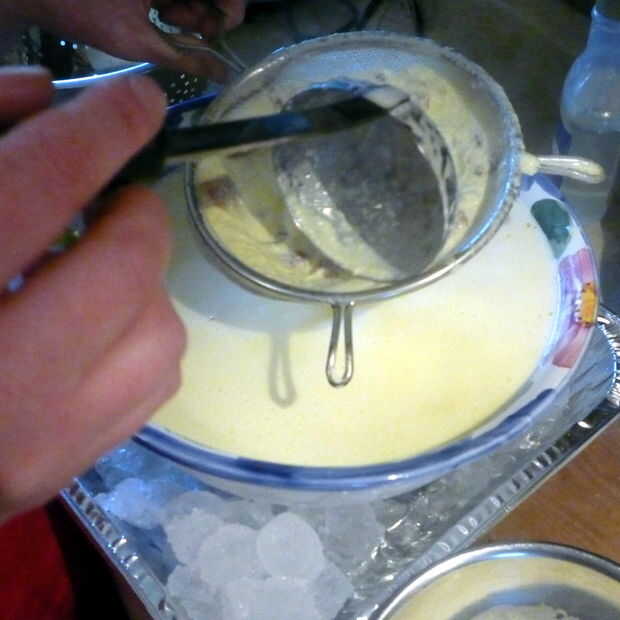 Vierta la mezcla por un tamiz en un recipiente grande enfriado con hielo, empujándola a través con una cuchara si es necesario. Deseche los trozos de tocino. Coloque el recipiente en la nevera hasta que esté listo para servir.