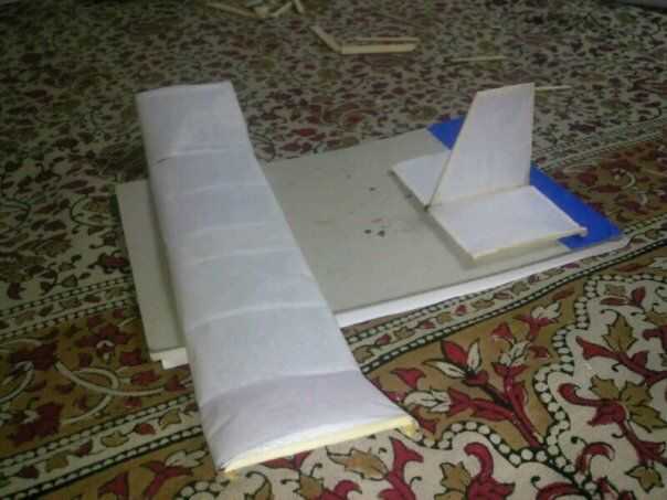 Use un papel estándar para cubrir las alas, timón y el estabilizador. Después de cubrir cada componente del pegamento del timón al estabilizador como se muestra en la foto.