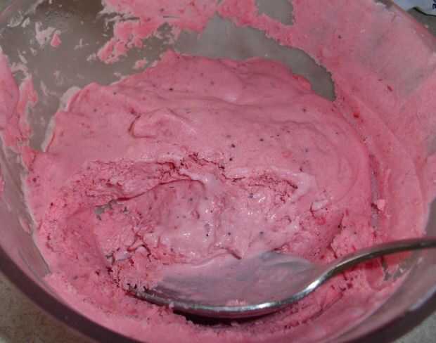 Mezcla de plátanos, luego se mezclan con otros ingredientes y vierta en un recipiente. Poner en el congelador. Cada 45 minutos revuelva la mezcla con un tenedor para no forman los cristales de hielo. Hacerlo hasta que no será necesario. Y ya está!