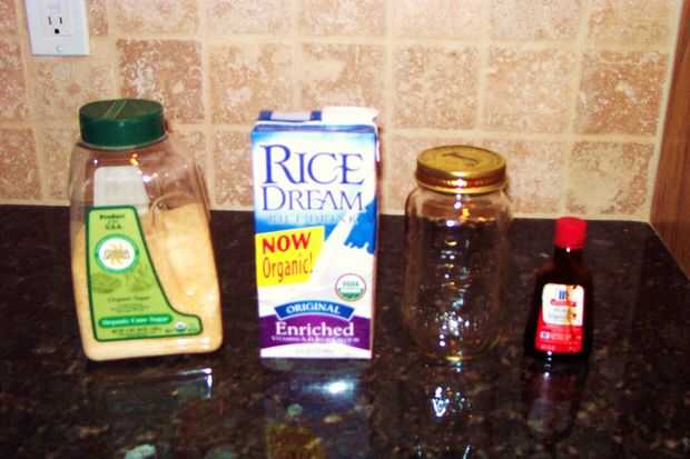 1. leche - 1 taza o 240 mL - utilizado leche de arroz; sólo asegúrese de que si la leche es dulce, use menos azúcar