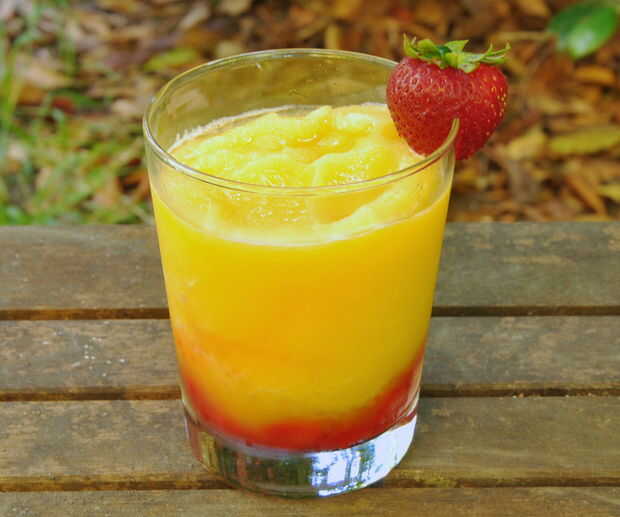 jugo de Mango es simplemente delicioso! Ahora solo mezcla en algunos jugo de piña-naranja, compota de fresa, un poco de ron y congelar y tendrás una bebida refrescante de verano congelado!