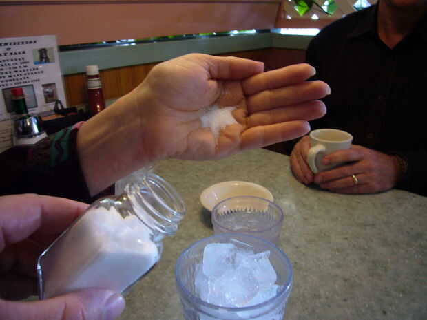 No es necesario tanta sal. Para un vaso grande de hielo de agua hará un monto total de cerca de un tercio de un salero para el vidrio entero. Así que para la primera capa sobre una cuchara sopera o dos.