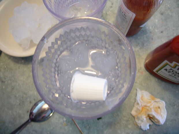 tengo una bandeja del cubo de hielo congeladora en forma de vasos de chupito, fue inspirado a ir más allá de utilizar esto para tomar una copa y vino para arriba con la idea de un cóctel de camarones. El único problema que tengo es el vidrio de fusió