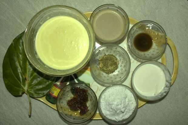 1. leche condensada (250 ml) 2. en polvo o azúcar glas 3. nata (200 ml) 4. betel hojas (Paan) (4 a 5 no.s) 5. Gulkand (reserva dulce de rosa) (100 g) 6. semillas de hinojo (50 g) 7. Cardomom (5 a 6 no.s) 8. color (verde) de alimentos 9. Rose deja