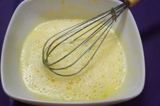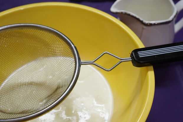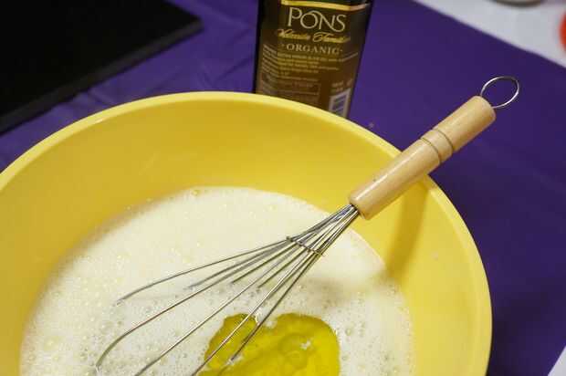 Verter la crema por el colador de metal en la crema. Esto eliminará cualquier bit de huevo que puede ser en la mezcla. Revuelva para combinar y luego añadir el aceite de oliva y vainilla y bate.