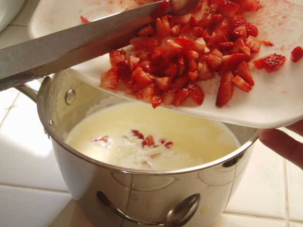 Una vez que la fruta cortada en cubos se puede añadir a la natilla fría mezclar y poner en la máquina de helados para el proceso. La cantidad de tiempo y trabajo necesario para congelar el helado varía considerablemente de una máquina a máquina (y receta a receta).