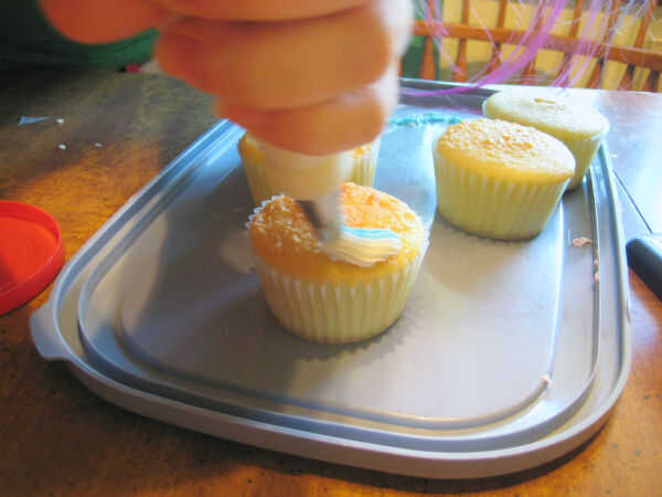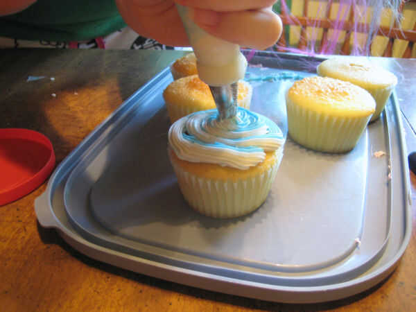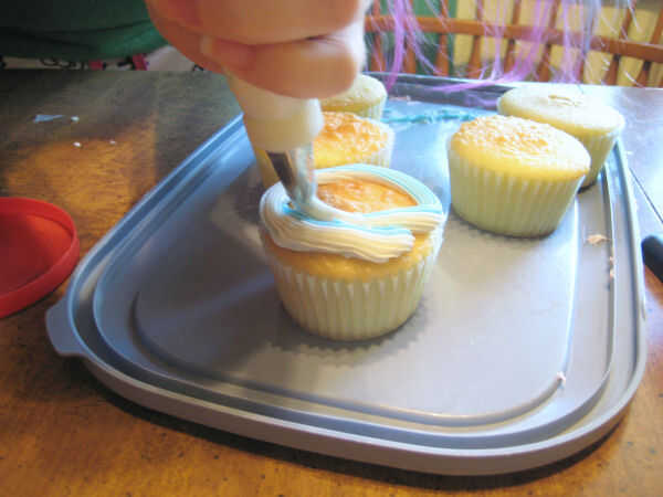 -Tienes que trabajar la cubierta hacia abajo en la punta y asegúrese de que ambos colores están saliendo antes de empezar a helar los cupcakes.