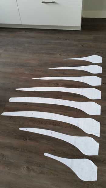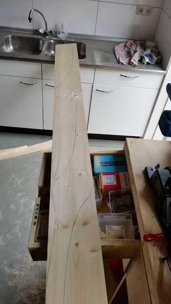 Primero imprimí las diferentes capas en papel A4 normal. Cambié las medidas en Photoshop para obtener un ruff 1,5 metros largo hélice. Esto fue todo hecho sin una regla un tapemeasure. Yo un poco lo comentar. Entonces remonta les sobre en la madera. Usé 2 diversas clases de pinos por lo que se vería bonito.