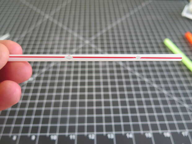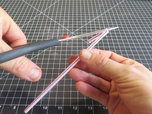 Comienza por cortar estos dos agujeros espaciados en la paja flaca. Doble hacia atrás y cortar una cuña triangular por lo que cuando despliega, hace dos diamantes.