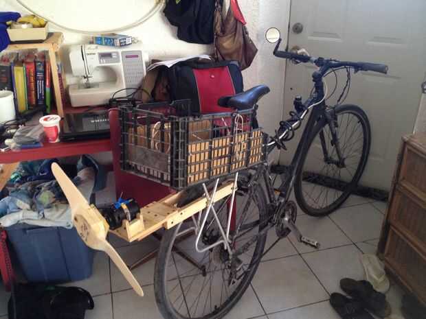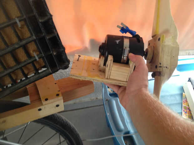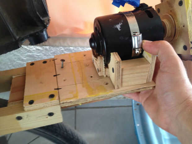 El motor y la hélice tienen su propio montaje de la madera contrachapada de 3/8 de pulgada. Esta pieza puede atornillarse fácilmente sobre el bloque en el soporte para bicicleta. Usé un sharpy para ayudar a alinear los orificios. Esta forma el motor y hélice pueden fácilmente extraerse e instalarse a la moto.