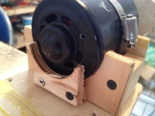 Para el primer diseño del motor era sólo conducto grabado en. Fue super peligroso porque sólo podría sacar el motor. Usé dos abrazaderas grandes para bajar el motor en el Monte. También tengo una parada de madera detrás del motor. Esta hélice empuja el motor para ir hacia atrás y se detiene por este pedazo de madera.
