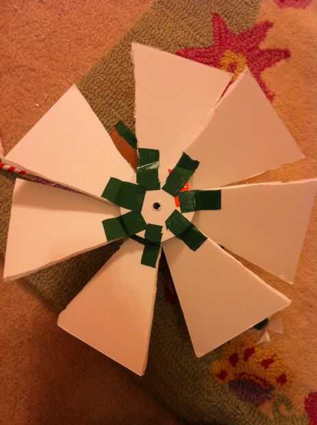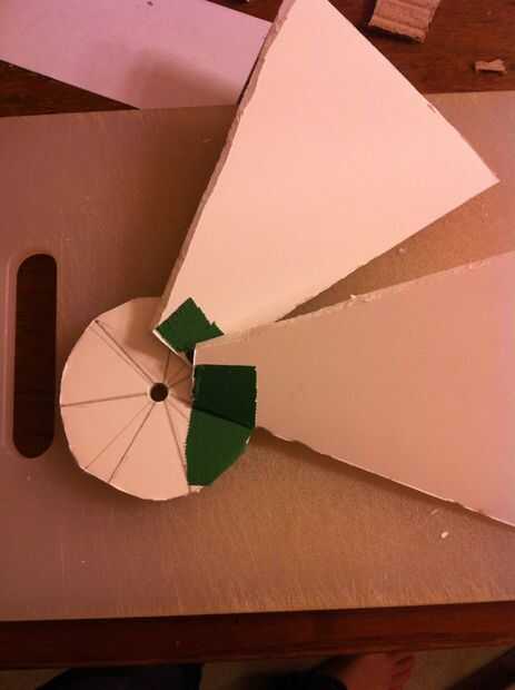 Corte trapecios grandes 5-10 de foamboard a ese ajuste juntos alrededor de un círculo de tamaño de la cinta del conducto. Luego, raspar la parte del espuma/papel el borde de un lado y redondear las esquinas del otro borde. Cinta adhesiva entre dos círculos de cinta en tamaño de conducto formando un ligero ángulo. Corte un agujero del tamaño de su eje en el centro. Repetir en una escala más pequeña para el motor pequeño.