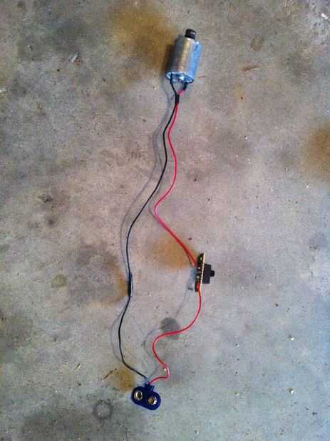 Tomar el complemento de la batería de 9 voltios y el positivo a uno de los conmutadores de la soldadura. Soldar el cable de tierra a la toma de tierra del motor superior. Luego soldar el cable positivo del motor al otro lado del interruptor. Después de eso, la cinta las soldaduras expuestas con cinta aislante. Luego hacer lo mismo, excepto con el motor más pequeño y la batería del AA. Si esto es confuso, ver las fotos. * Nota: * tuve que soldar cables en mi motor más pequeño y la batería AA, por lo que los cables parecen diferentes.