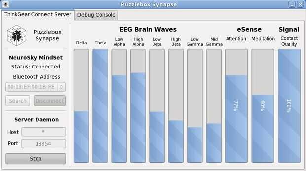 Para comenzar te será necesario establecer una conexión Bluetooth con su Mentalidad de NeuroSky. Instrucciones sobre cómo hacer esto si se han proporcionado con el auricular y están fuera del alcance de este documento. Dicho esto que si usas Windows XP, se recomienda que utilice la pila de Toshiba Bluetooth (suministrada en el CD de instalación del auricular) en contraposición a la pila de Bluetooth de Microsoft incorporada. Simplemente hemos tenido mejores resultados con el software de Toshiba. El valor predeterminado pin de Bluetooth para la Mentalidad de NeuroSky es "0000" y una vez conectado, debe tener un nuevo puerto COM para tu sistema windows o /dev/ttyUSB bajo Linux. Los usuarios de Mac OS X se anima a intentar ejecutar el software de fuente usando un intérprete de Python y reportando los problemas pueden surgir. El software debe ser compatible pero ha no se ha probado con ni empaquetado para OS X en el momento de la escritura.