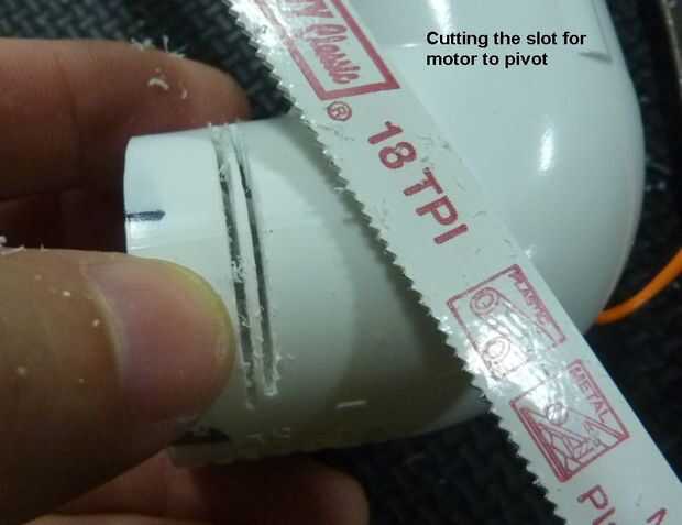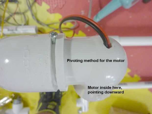 Pivotante motores: Vea las imágenes GIF animadas. Encontré un pequeño tornillo que gustó y encontré una broca de taladro para que coincida con el diámetro. Luego hice dos cortes de sierra muy cerca en el 1" codo como se muestra.