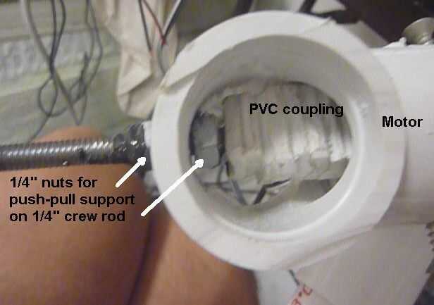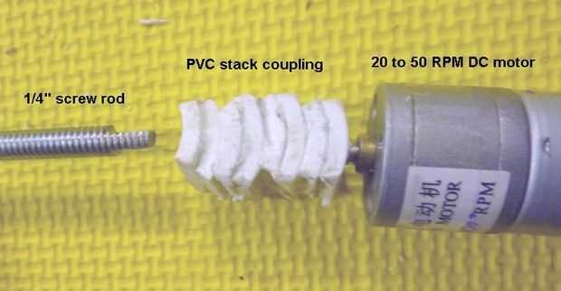 Eje de conexión a tornillo largo: Sólo dura lo que siempre parece ser un problema (con DIY como yo que no soldar... aún) se une a la 1/4" eje del tornillo en el extremo del eje del motor. Hasta ahora lo mejor tenemos es cortar 7 de 1/2 "x 1/2" piezas de PVC de un acoplamiento que es el plástico más duro y doblarlas más plana con pinzas. Tijeras podadoras de metal son más fáciles para esto que sierra o dremel. Luego uso de epoxy, no pegamento del PVC para hacer una pila (no encajan perfectamente, para que cemento de PVC es arriesgado). Esto forma un bloque duro de plástico que se pueden taladrar cada extremo, uno para el eje del motor y otro para el tornillo de 1/4". Usar dremel para cuadrar los ejes motor y tornillo y hacer 2 perforaciones de lado a lado en el plástico en cada lado, para cada eje, dejando algún juego en el orificio del eje 1/4" para que el motor no"enlazar"a una parada. Para mantenerlos juntos y evitar la fuerza en el eje del motor, un casquillo de acoplamiento o al final de T o codo se fija delante de motor (no se muestra en la animación actual), 3/8 orificio perforado de 1/4" eje pase a través y una tuerca en el eje se ajustaron a cada lado del agujero del PVC para permitir el 1/4" tornillo fuerza en PVC en lugar de motor , dejando el motor y su pila de PVC de acoplamiento para el tornillo 1/4" PVC. Mantenerse más motor gire dentro del PVC por epoxi si estás seguro de ti mismo o por un tornillo a través de PVC para su primer intento si eres a diferencia de mí, y por lo tanto más sabio.