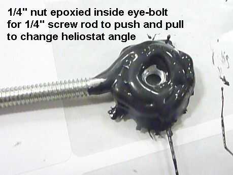 Conectar el otro extremo del tornillo largo: si se suelda con autógena una tuerca de 1/4" en el ojo de la armella, cuidadosamente Seleccione el perno de ojo de Lowes para que la tuerca de 1/4 puede ir dentro y liberalmente aplique epoxi todo el mundo que rodea el extremo del ojo del perno excepto en las roscas de la tuerca. Debe ser capaz de soportar 10 veces más fuerza de viento que puede soportar el resto de los helióstatos de PVC.