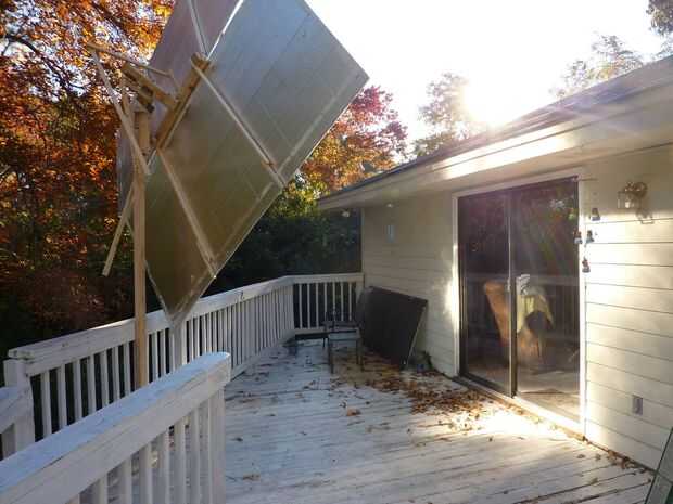 Las imágenes muestran un último intento, un «stand» que llevó a cabo tres 4 x 8 para una ventana, pero la intensidad del calor era demasiado peligrosa y ajuste del ángulo de cada tablero varias veces al día era una molestia. Mi diseño no fue capaz de resistir más de 15 o 20 mph viento.