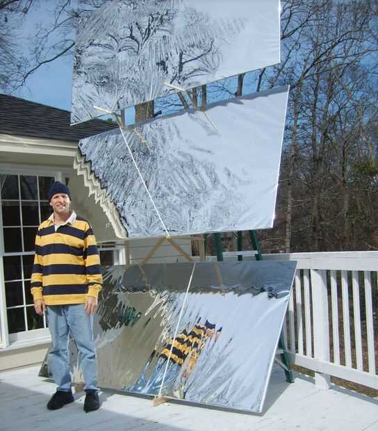 También he construido cajas de aire caliente (ver última imagen para saber cómo doblar la luz en una caja de aire caliente que tiene plástico de invernadero como la "ventana". Los reflectores a cada lado se retrasó en 30 grados de inclinación. ductos de 6" dentro y fuera de casa es el principal problema. 50% eficiente versos la eficiencia del 70% del aluminio puede diseños (no vale la pena)... uno de 4 x 8 necesidades por lo menos 100 CFM 4" fan de MPJA o bgmicro. El respaldo fue pintado con negro pintura temp alta Rustoleum un tablero aislante de 4 x 8. El fue sin madera forro, sólo 1/4" playwood (luan) lados con un soporte de estantería de 2 en cada esquina y dos de 1 x 2 1/3 y 2/3 longitud del aislamiento del tablero para apoyo... pesaba sólo 15 libras. Los reflectores de mylar cubierto doblados encima para cerrar la caja para el transporte. Ver mi canal de youtube si quieres loca con cálculos de la caja de aire caliente y el helióstato de eje gire.