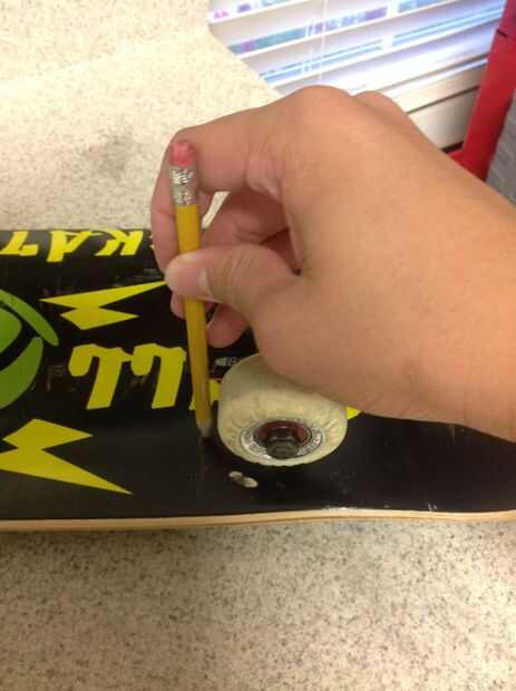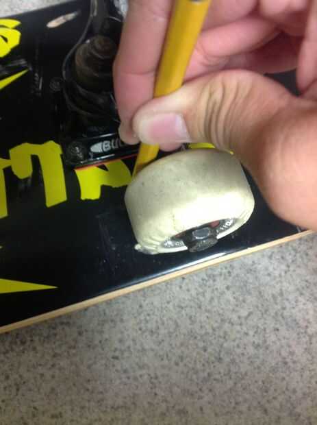 Ahora, asegúrese de hacer esta parte bien porque va detrás y marcado y corte no es demasiado divertido. Asegúrese de que el lápiz es recto hacia arriba y hacia abajo y no en ángulo para hacer suficiente espacio libre en el orden de las ruedas rodar. Si sus camiones están ya puede hacer sus marcas, si no simplemente ponen los acerca de donde deberían estar y asegúrese de que no te muevas para que pueda obtener marcas precisas. Marca en ambos lados de las ruedas y de la espalda de ella para marcar por donde cortar. Revisa los cuadros si usted necesita ayuda.