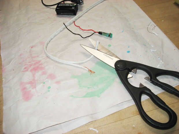 Tengo un pedazo de cable de la lámpara y había despojado de los extremos de los cables por lo que tendría una buena conexión cuando conectado a los cables led que vienen de la cabeza. El cable de la lámpara va de la cabeza, por el interior y hacia fuera de la parte inferior para conectar con la batería. Eso es mi parche hasta más retoques.