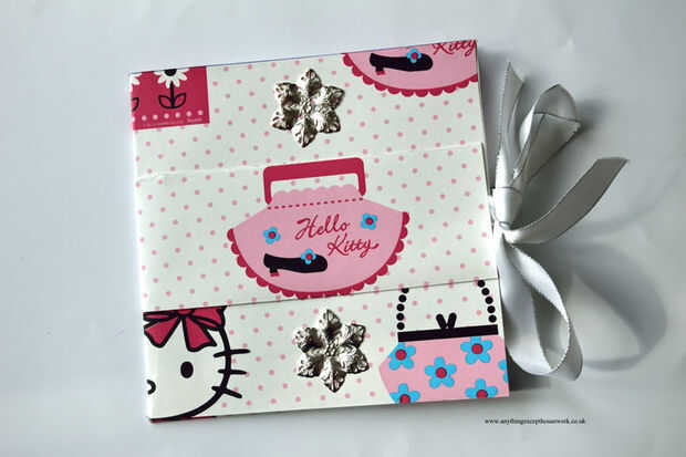 Hola, sólo quería compartir una idea que tuve sobre mi propio papel de scrap-booking de doble cara 12 x 12 pulgadas con fondo de pantalla. En este caso, usé un rollo de papel pintado de Hello Kitty que encontré a la venta en una tienda local. Entonces, hice un mini-album de 6 x 6 pulgadas fuera de la Plaza de 12 pulgadas. Fue muerto fácil y tomó unos 45 minutos.