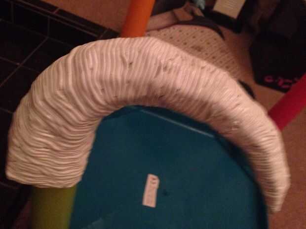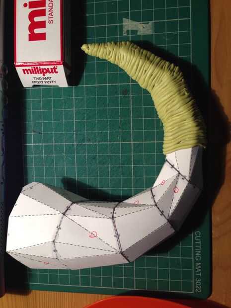 Con los cuernos de pepakura no Unidos al casco principal, quería envolverlos como un cuerno de animal apropiado, he utilizado masilla de apoxy para arropar a los cuernos, mezclar la masilla en etapas y balanceo hacia fuera lo más finas posible y luego envolver los cuernos desde la punta hasta la base, ADVERTENCIA! Este es un largo proceso! Como larga estúpido! Me tomó dos días para que se vean bien! No estoy seguro esta es la mejor manera, pero tengo que trabajar dentro de mis posibilidades y esto es lo que me pude permitir,