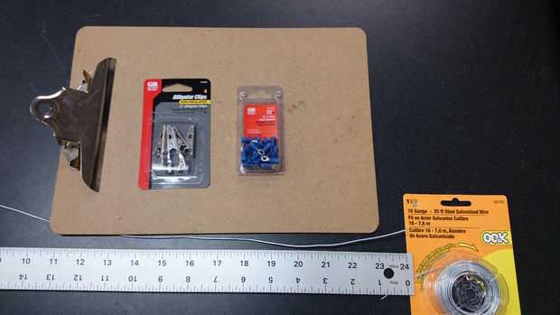 Corte 12" de alambre de acero galvanizado. 12" es aproximadamente la longitud del borde largo en un portapapeles. El cable que se muestra en las fotos es 24" de largo y 12" de demasiado tiempo.