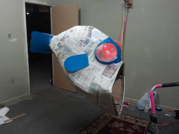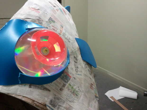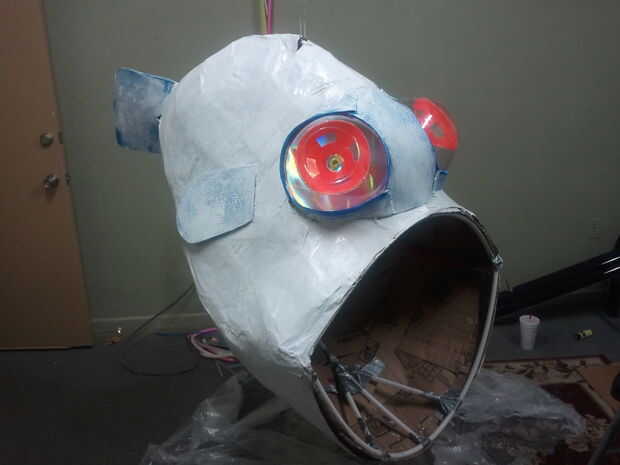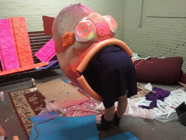 Después de seca la imprimación, cepillo había pintado todo su cuerpo plata y agregado destaca rosa y naranja con pintura en aerosol. Había añadido abrigo de burbuja pintada y coche naranja scrubbies de textura y hacen los dientes de plástico corrugado. Labios son los tallarines de la espuma, a la mitad de la raja (todos de espuma y piezas de tablero plástico son chatarra, donado por una empresa local a mi colectivo). Llena el interior del cuerpo en láminas de plástico negro que fue roto y desechado. La imagen de mi boca de media de Henriette es de cuando caliente pegué en.