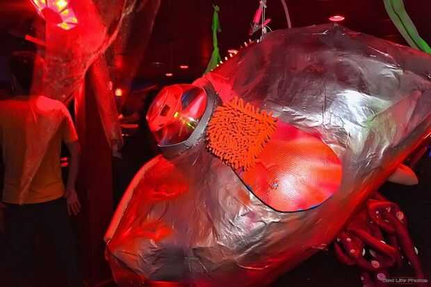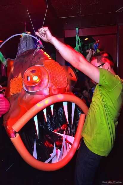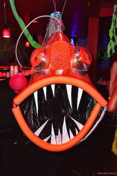 Para el acabado le, he añadido una linterna pequeña de papel rosa para simular los señuelos bio-luminiscentes de rape y una cadena de LEDs naranja en la frente. Estas fotos son de ella en la fiesta; en el plano frontal, su labio es un poco flojo de ser derribado. Esto se explica en la segunda foto (como él era uno de los muchos). La última foto da un poco mejor idea del trabajo de pintura.