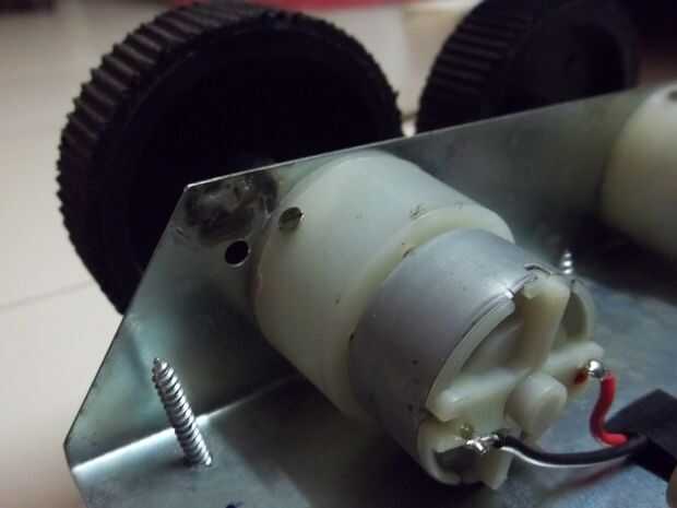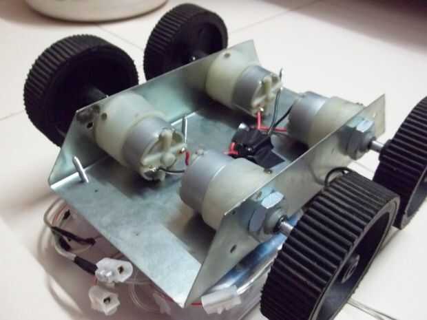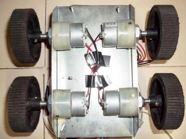 Los grandes tornillos del motor facilitan el montaje en chasis. Las ruedas deslice sobre el eje del motor y se jodan en su lugar. Conectar los motores del lado izquierdo en paralelo. Conectar en paralelo los motores de lado derecho. Después de montar las ruedas y cuatro motores, debe tener algo que parece la primera imagen.
