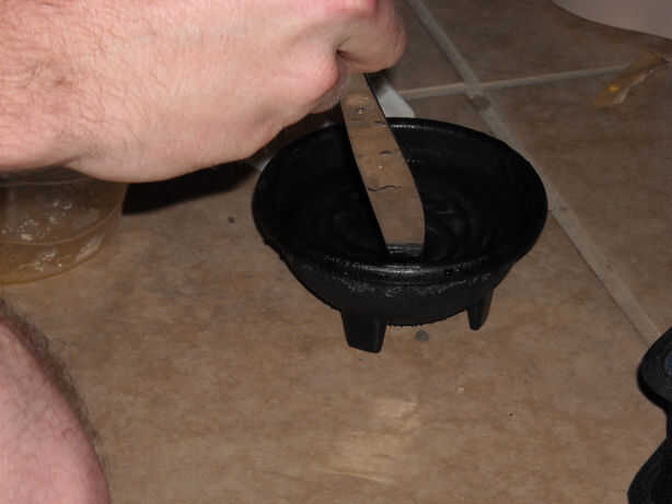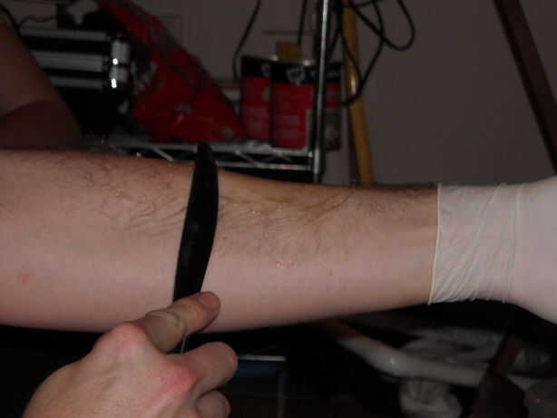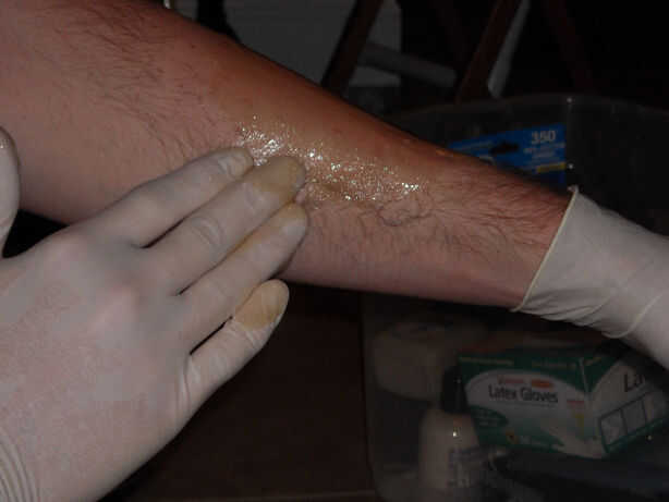 Una vez que el gel es aplicado, tomar el cuchillo y sumergir en el agua caliente aún. Se usa para suavizar los bordes de la gelatina para que la herida se mezcla con tu piel. Se necesita sumergir la hoja varias veces como el gel se remoje un poco del agua y como el se enfría cuchillo comenzará a pegar.