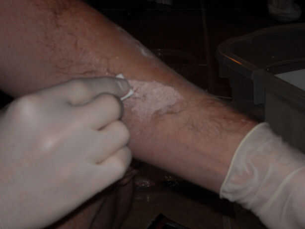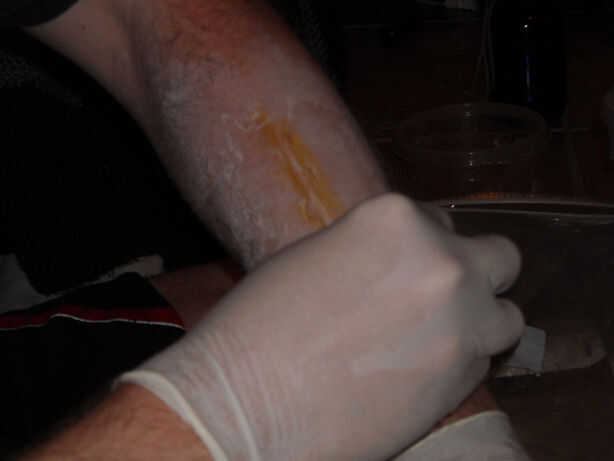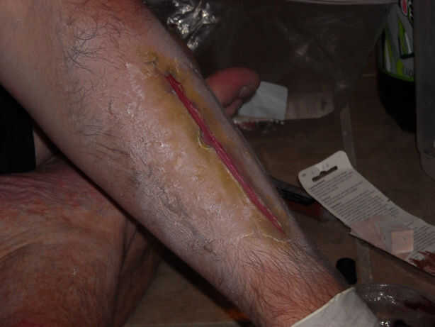 Aplicar hasta que los bordes de la herida. Te recomiendo una "rueda de hematoma" que es una combinación de rojo, negro, verde oscuro amarillo y marrón. Cuando la piel se rompe suele ser una experiencia traumática y el hematoma la rueda le permite crear esa mirada insalubre en lo panelesde la herida. Fui con el amarillo como base, un poco verde a lo largo de la longitud, negro y morado en los bordes.