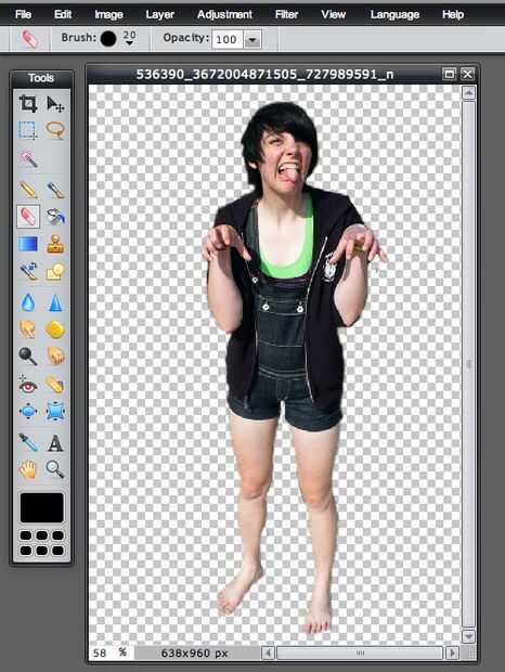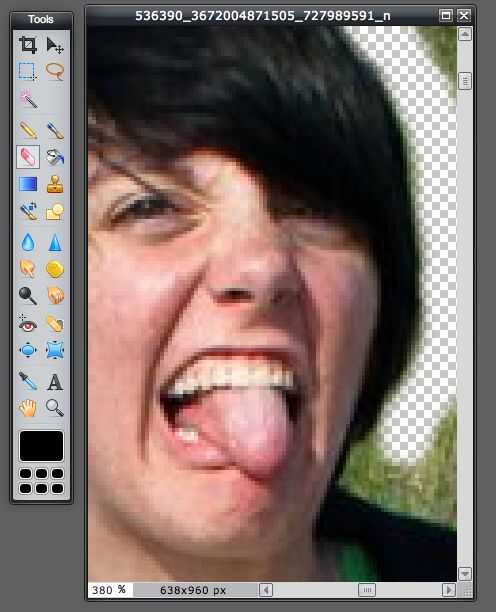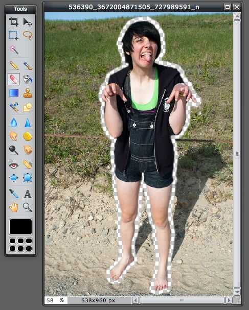 Modo de zoom en la imagen y comenzar a borrar alrededor del borde de tu hermana (o a otros humanos). Mueven lentamente alrededor del cuerpo, asegurándose de que sus aristas son líneas relativamente suaves. Me gusta ir por todo el cuerpo, saltar las pequeñas áreas poco entre los dedos y las piernas. Volver a estas áreas pequeñas con un pequeño cepillo borrador después de completar el primer esbozo inicial del cuerpo para que usted no tiene que alternar entre el tamaño del pincel.