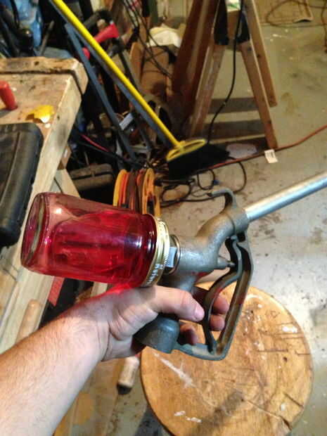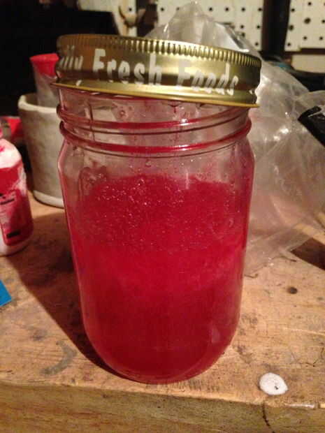 El recipiente que usé fue un frasco de aderezo para ensalada que había terminado. Lo único que hice para la jarra era taladrar un agujero en la tapa para fijar a la bomba de gas.  El "Adán" es champú para hombre con algunos Smooth-on tan fuerte pigmento rojo mezclado en él.
