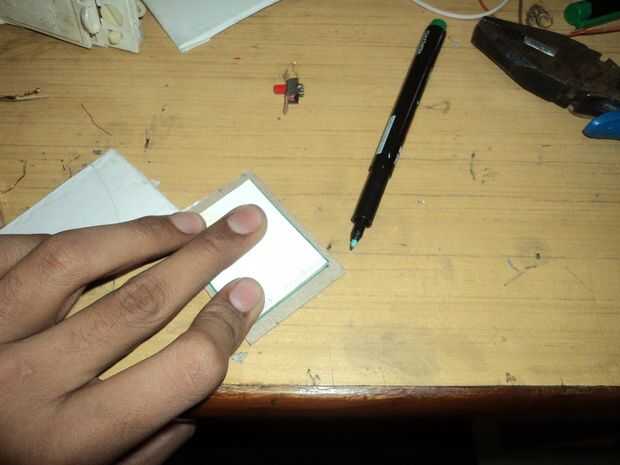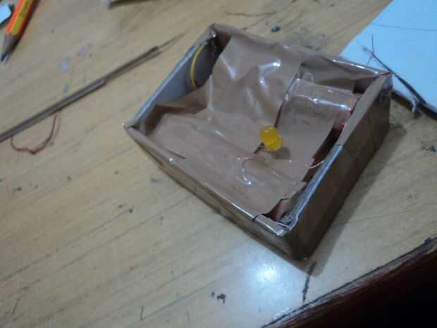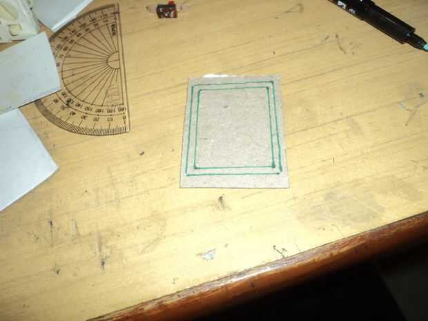 Hacer y unirse al circuito como se muestra en la imagen y dejar los alambres para el interruptor fuera de la caja y luego marque el tamaño de la foto en la cartulina rectangular y sorteo uno más margen de unos 2 MM dentro del rectángulo exterior como se muestra en la última fotografía