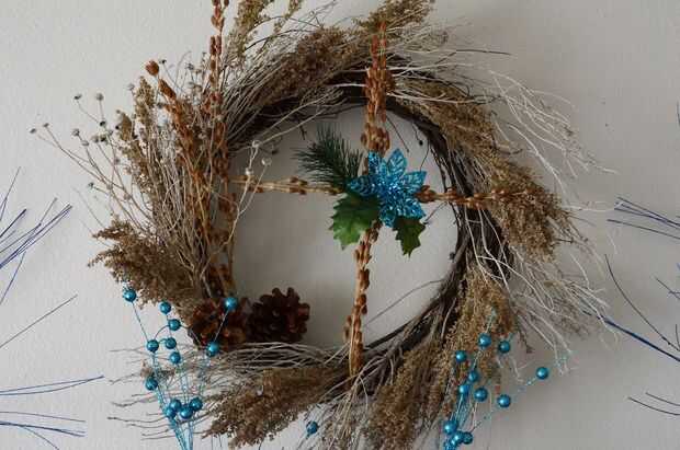 Había añadido un par de piñas a la corona e inserta sólo un poco seca de flores, junto con algunas de las ramas blancas de cepillo conejo. Mi parte favorita de este proyecto fue mi idea de utilizar las vainas secas para hacer la cruz que inserta en la zona centro. Era totalmente natural y original también!