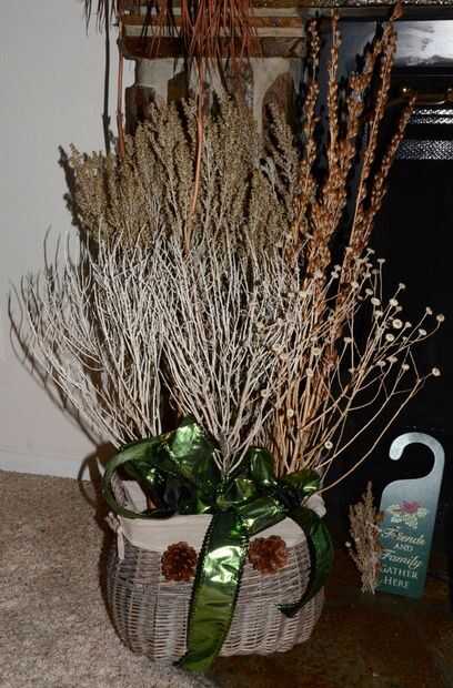 Mi siguiente idea era añadir algo en cada extremo de la chimenea que podría enmarcar los lados. Encontré algunas cestas grandes agradables (pero se puede utilizar cualquier recipiente grande) a casa de mi largo tallo pedazos de material. Éstos incluyeron, Artemisa, cepillo de conejo, dos tipos de macetas y algunas vainas secas rojo que no tengo ni idea lo que eran!