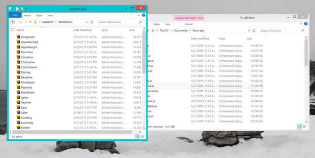 Abra el archivo JPEG, HandyGuide. Esto nombre y todo lo que se puede descargar desde los enlaces de Dropbox demostrarle. Copiar y pegar los enlaces en tu navegador. No dude en descargar todos o elegir los que desee utilizar. De las acuarelas, lo voy usando Tranquila (azul), Sailorific (azul), Latte (oscuros) y Polka (rosas). Guardarlos en el mismo lugar que todo lo demás. Lo que obtendrá es un montón de archivos zip que incluye un archivo .ai de la muestra para las versiones Windows y Mac de Illustrator.