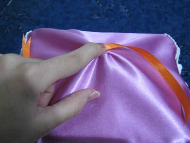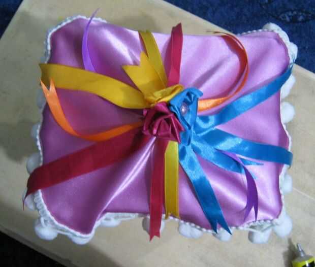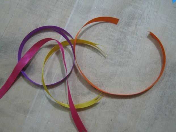 Recortar unos trozos de cinta de color y palillo uno por uno en la parte superior de la lámpara, como se muestra. Ajustar allí las flores de la cinta y pegar.