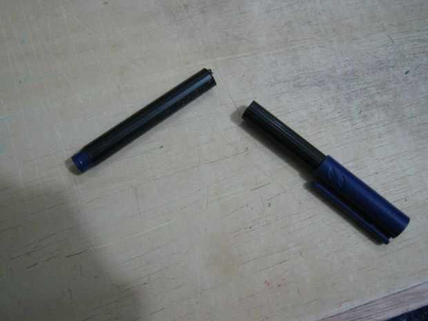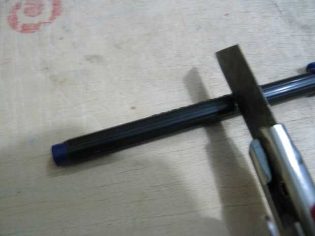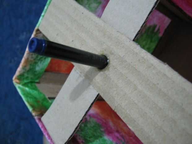 Tomar una pluma vieja y cortar desde el centro. Fije en medio de las rayas transversales.