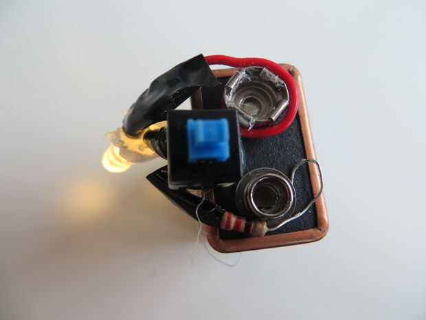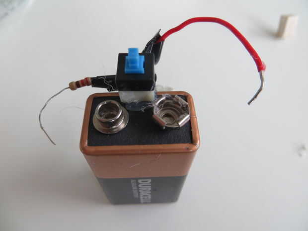 Aquí tenemos una versión modificada del circuito de la que aprendió a hacer en los pasos 2 y 3 de este instructables. La diferencia es la batería de 9V y el diferente estilo de empuje el interruptor de bloqueo. Estos es un opcional cambios, puede utilizar cualquiera que sea pilas desea que pueden encender LEDs y cualquier estilo de bloqueo de botón.