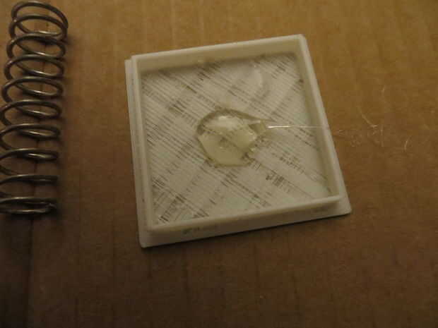 Si usted decide utilizar un resorte, tomar algunos pegamento caliente y utilizar para garantizar un resorte en su lugar. Esto se puede mover en la esquina opuesta al circuito si lo desea. Encontré que la carcasa era tan ligero que no necesita un resorte adicional, pero pensé que me gustaría añadir en caso de que quiera hacer un BBTL... que hermoso grifo-luz grande ;)