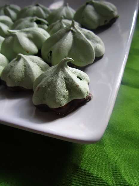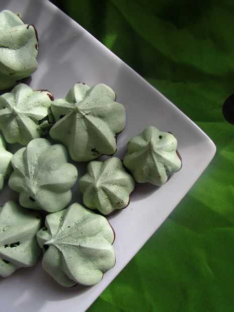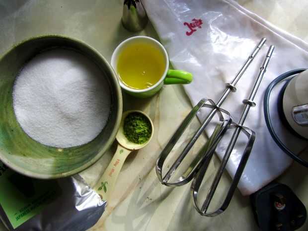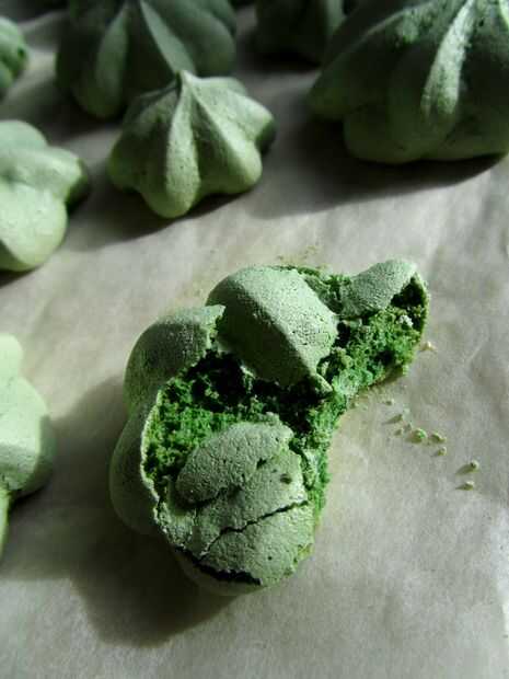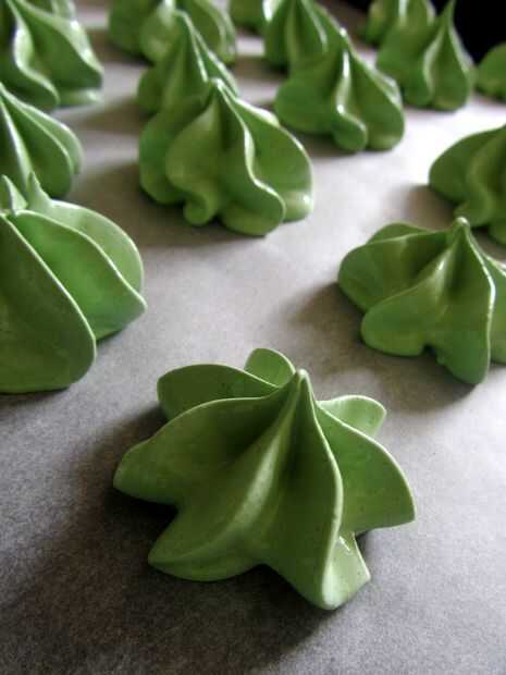 2 claras de huevo, 125 g de azúcar impalpable, 1 tablepsoon de polvo de matcha (té verde) (más si te gusta la materia), 1/4 de cucharadita de cremor tártaro y un poco colorante de alimentos verde pasta si quieres un color más vibrante (el color de matcha palidece mucho durante el horneado). Usted también querrá un batidor eléctrico, una manga pastelera y una punta de estrella, junto con la parafernalia habitual de la cocina.